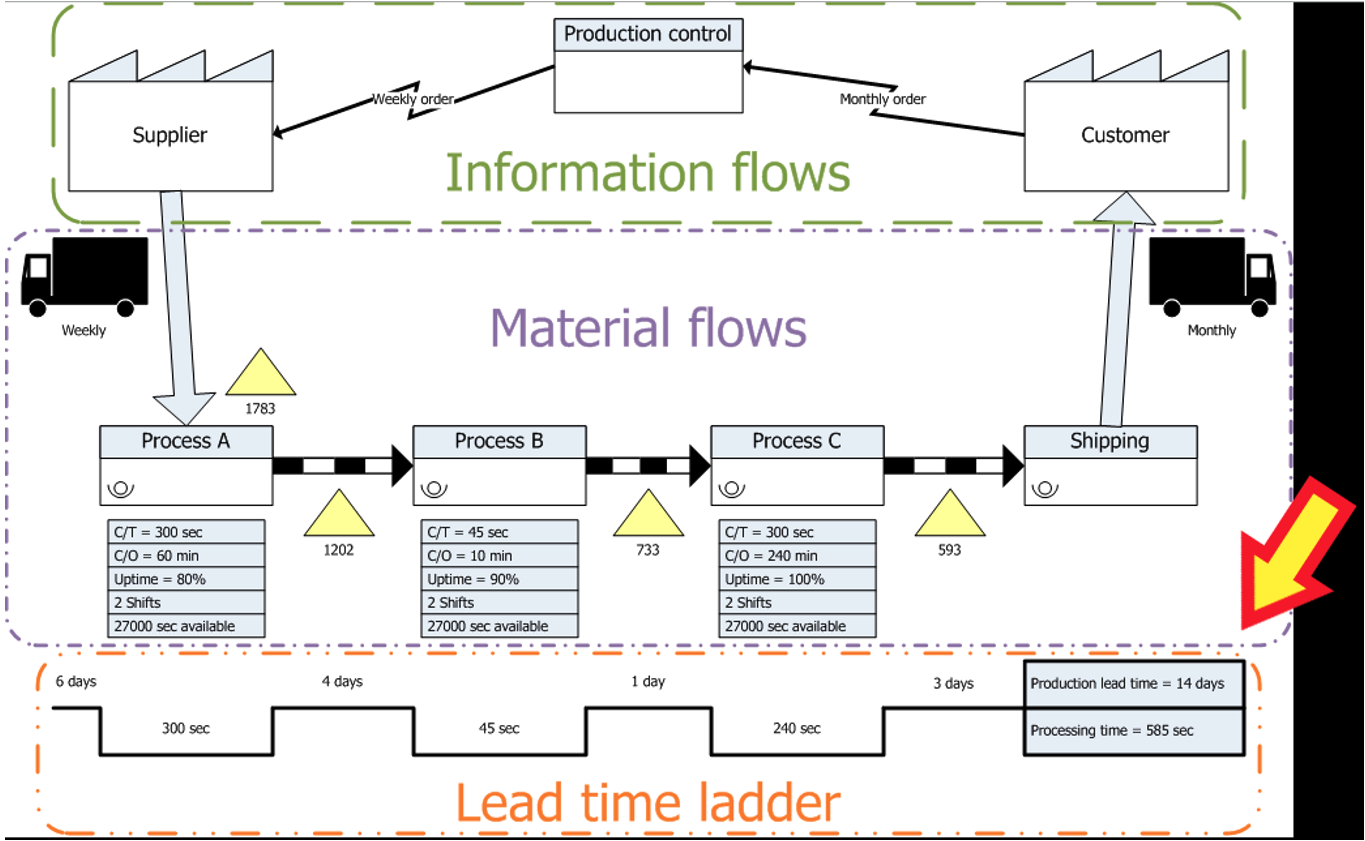 The following Lean Value Stream Map (source: Wikipedia) indicates that there is plenty of potential to reduce lead times. In this scenario, the Value Added time of 585 seconds is a small fraction of the 14-day duration spent in production…