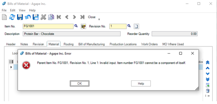 As per MISys, “a Recursive BOM is a bill of material that includes itself as a component”. If you try to add an assembled item as a component to its own Bill of Material, MISys will give an error, preventing you from creating a ‘Recursive BOM’.